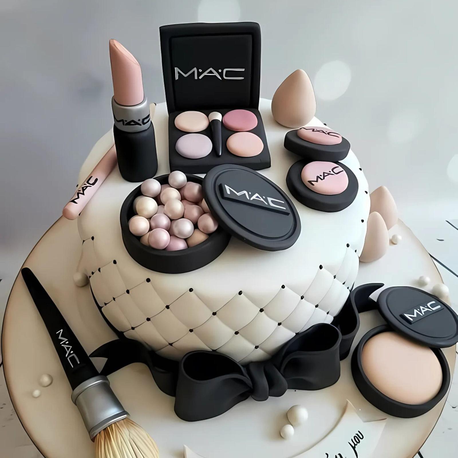 Classic MAC Brand Beauty Cake, MAC Cosmetics cake, makeup themed cake, beauty birthday cake, beauty lover cake, cosmetics cake, chic makeup cake.